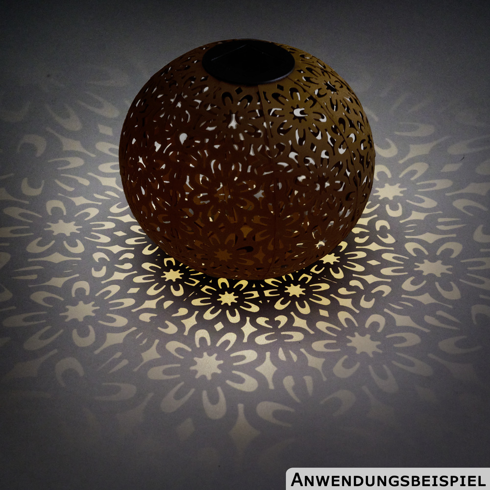 Die Solarlampe aus Metall hat einen rostigen Stil und eignet sich sowohl als Tischlampe als auch als Bodenlampe. Die Kugel verfügt über einen ON/OFF-Schalter sowie einen Erdspieß. Tagsüber vollständig aufgeladen leuchtet sie für ca. 6 Stunden.