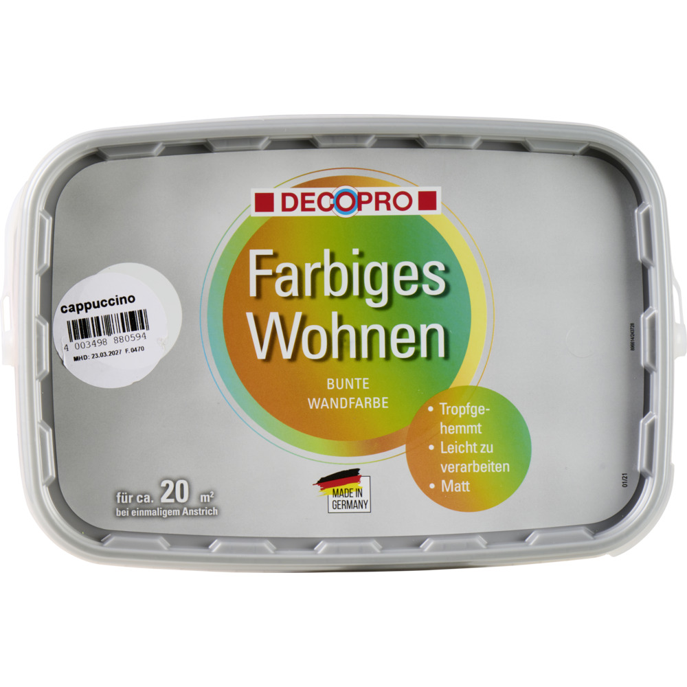 Die Wandfarbe von DECOPRO ist eine fertig abgetönte Innendispersionsfarbe. Geeignet für Neu- und Renovierungsanstriche in allen Wohnräumen. Normal beanspruchte Wand- und Deckenanstriche auf Raufaser- und Strukturtapeten, Papiertapeten, Gipskartonplatten, alte Dispersionsfarben und Kunstharzputze sowie Mauerwerk, Putz und Beton. Diese Wandfarbe wurde mit dem Umweltzeichen "Blauer Engel" ausgezeichnet, sie ist daher emissionsarm. Die einfache Verarbeitung und die hohe Deckkraft wird dich begeistern.