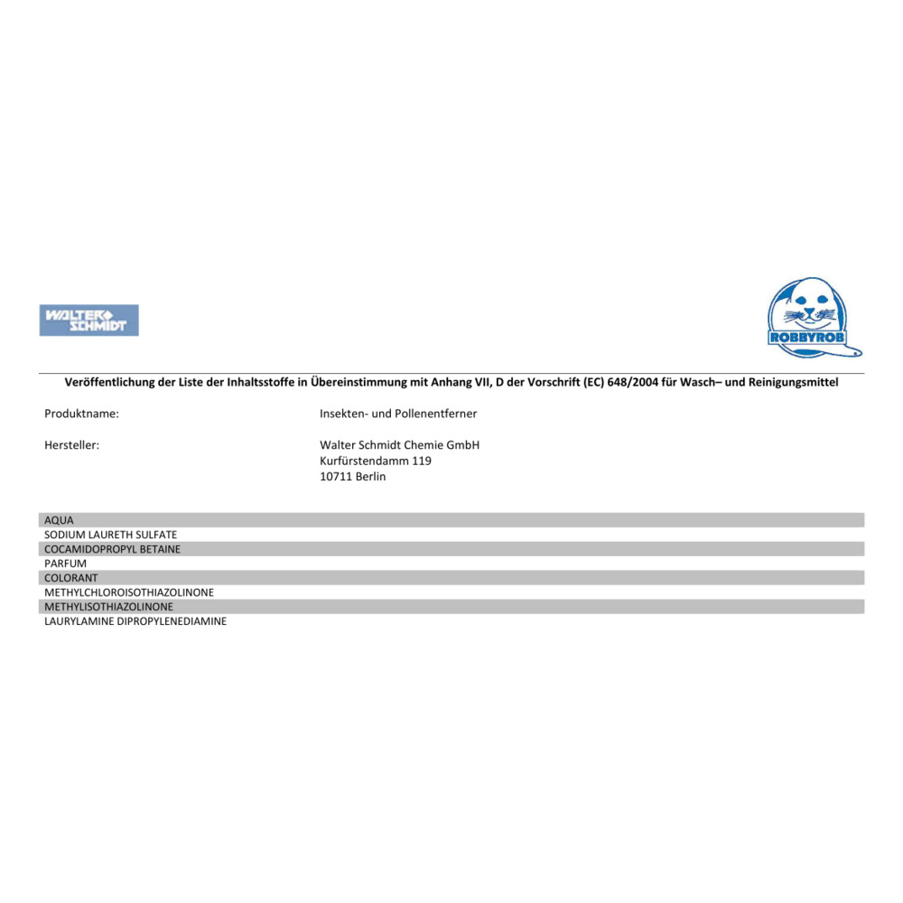 Der Insektenentferner beseitigt sehr gründlich organische Verunreinigungen und Insektenspuren auf deiner Windschutzscheibe und Karosserie. Der Reiniger beinhaltet keine Hydroxide und ist für Aluminiumelemente oder alkaliempfindliche Materialien geeignet.