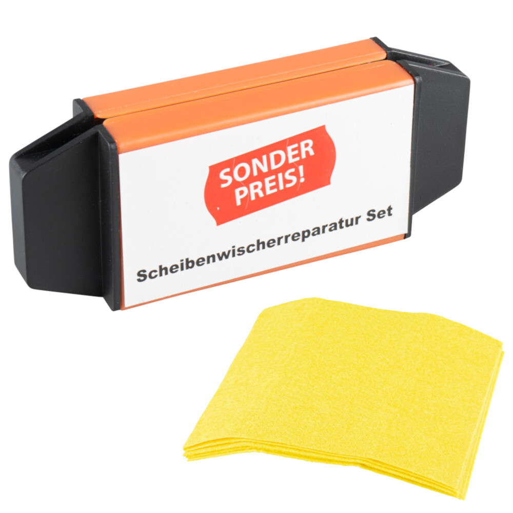 Das handliche Scheibenwischer-Reparaturset der Marke Sonderpreis sollte in keinem Auto fehlen. Das Set bestehend aus einem Scheibenwischer-Schleifer und 5 Vliestücher eignet sich zur Reparatur von Scheibenwischern jeglicher Art. Einfach die Wischblätter durch die Vorkehrung des Schleifgerätes durchziehen und schon werden die Gummilippen des Wischers geschliffen. Die mitgelieferten Vliestücher erleichtern die spätere Reinigung.